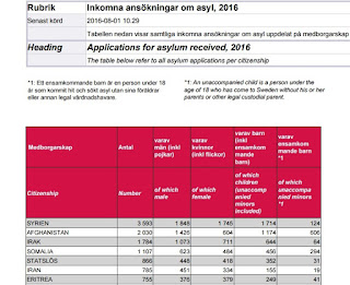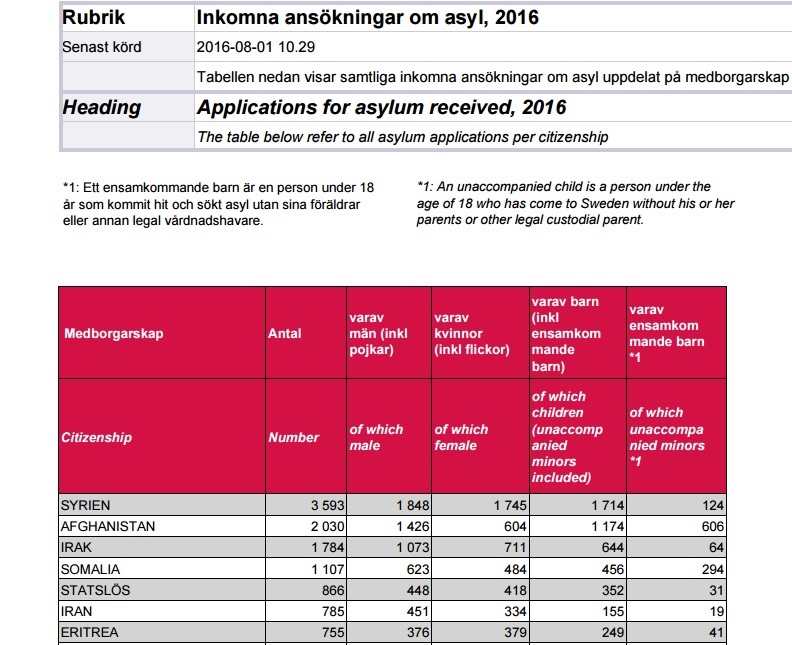 الارقام تعكس انخفاض كبير في طلبات اللجوء المقدمة الي مكتب الهجرة السويدي خلال الفترة من بداية العام 2016 الي نهاية شهر يوليو/تموز 2016 ، حيث وصلت الي مايقارب سبعة عشر الف لاجي ، مقارنة بالعام السابق حيث وصلت الي 80 الف لاجي لنفس الفترة الزمنية لعام 2015، واستمرار المراكز الاولي للعام الثاني علي التوالي للجنسيات الاعلي طلب للجوء بالسويد (سوريا وافغانستان والعراق ثما فلسطني سوريا )هذا الانخفاض كان لاسباب عديدة ذكرها التقرير السويدي وهي :