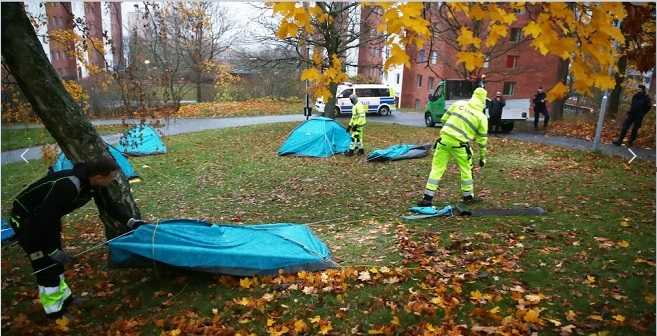 بعد 26 يوم من البقاء بالحدائق والمبيت داخل خيم بلاستيكية صغيرة ، أزالت الشرطة السويدية  في منطقة سولنا بستوكهولم، مجموعة من الخيام نصبها نحو 15 شخصاً من القادمين الجدد الأسبوع الماضي اغلبهم من سوريا وفلسطيني سوريا ، بعد أن جرى إخلائهم من شققهم بسبب انتهاء عقود الإيجار، وفقاً لما ذكرته صحيفة “داغنز نيهيتر”. المصدر بالسويدية اخر الموضوع