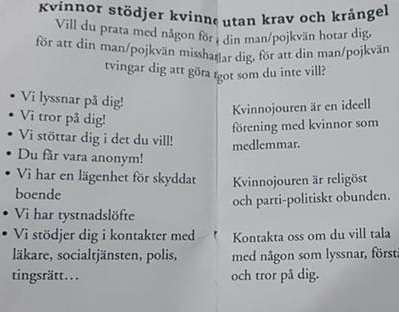 فيما يتعلق بدورات / وخط  هاتف دعم المرأة والفتيات من العنف ، فهذا نظام موجود بالسويد منذ سنوات وتم تنشيطه حاليا لتقديم الدعم للنساء المعنفات .