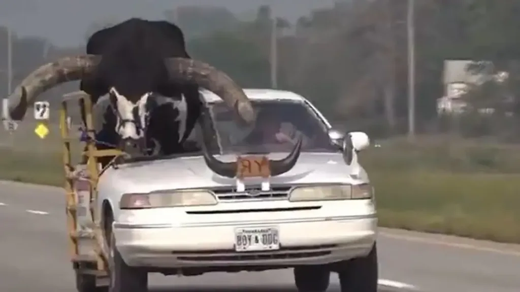 تظهر مقاطع الفيديو الساخرة الثور الضخم وهو يحتل مقعده في السيارة الصغيرة، حيث تبرز رأسه وقرونه الضخمة من السقف والزجاج الأمامي. لكن لا داعي للقلق، فقد تم تجهيز السيارة بباب جانبي خاص تم استبداله بدرابزين معدني، كما يُستخدم في حظائر الماشية، ليتسع مقاسه لهذا الثور الضخم.