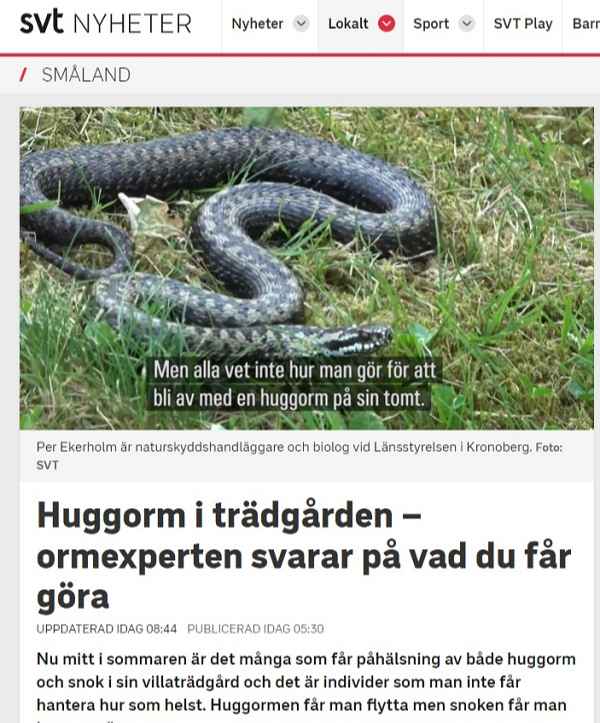 ويقول Per Ekerholm  وهو مسؤول الحفاظ على الطبيعة وعالم الأحياء في مجلس إدارة المقاطعة في Kronoberg  ، كما أنه المسؤول عن لإجابة على أسئلة الجمهور حول كيفية التعامل مع ثعبان في حديقة المنزل . ” هذا العام يوجد ظهور متزايد للأفاعي في المناطق الحضرية وفي حدائق المواطنين ، والكثير من الأشخاص  قلقين للغاية من دخول ثعبانًا في حديقتهم  ويريدون التخلص من الأفعى لأن الأحفاد يأتون لزيارتهم في عطلة نهاية الأسبوع ، كما يقول بير إكيرهولم.