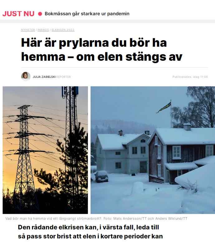نشرت العديد من وسائل الإعلام السويدية الكبرى تعليمات ونصائح للمواطنين خلال انقطاع الكهرباء “المتوقع” في الشتاء القادم ، والذي قد يحدث بسبب أزمة الكهرباء التي من المتوقع أن تشهدها السويد ودول أوروبا ـ