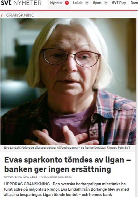 عرض التلفزيون السويدي تقرير عن حالات الاحتيال التي  يتعرض لها كبار السن ” المسنين” في السويد حيث خسر بعضهم كل مدخراتهم التي أدخروها لسنوات طويلة من العمل  – السويدية المتقاعدة إيفا ليندال والتي تبلغ من العمر 78 عاماً تقول إنها تعرضت للاحتيال وسرقة أموالها من حسابها البنكي في بنك  Länsförsäkringar ، ورفض البنك مساعدتها أو تقديم أي تعويض.