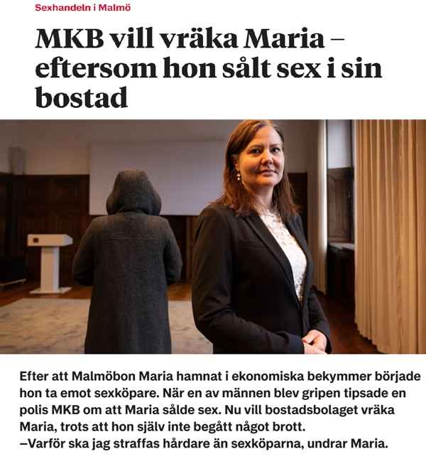 في إحدى قضايا السكن المثيرة للجدل في مالمو (Malmö – مالمو)، تجد  ماريا التي بلغت من  52 عاماً    نفسها مهددة بفقدان شقتها بعد قرار شركة الإسكان العامة MKB إنهاء عقد الإيجار. السبب لا يتعلق بتأخر الإيجار أو شكاوى الجيران، بل باتهامها باستخدام الشقة في نشاط مرتبط ببيع خدمات جنسية حيث أن ماريا تبيع الجنس مقابل المال لكي تسدد قواتير الإيجار والمعيشة حسب قولها.، رغم أن التشريع السويدي لا يجرّم بيع الجنس، وإنما يحمّل المشتري وحده المسؤولية الجنائية.