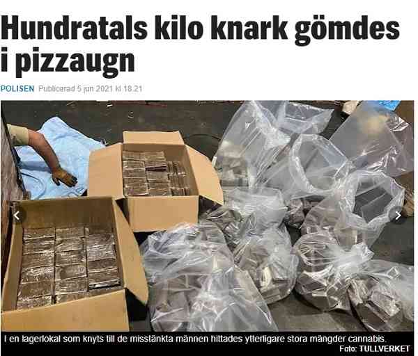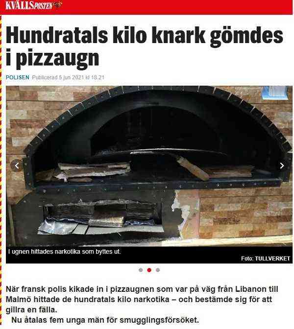خمسة رجال متّهمون بمحاولة تهريب 200 كغ من الحشيش إلى السّويد في فرن بيتزا، واكتشفت الشرطة الفرنسية الزيادة في الوزن وأبلغت شرطة الجمارك السّويدية ببدء عملية البحث في فرن البيتزا، تمّ إرسال الفرن في الأصل من لبنان ونزل ترانزيت في فرنسا ليكمل رحلته للسويد، وتبلغ القيمة السّوقيّة للمخدّرات المهرّبة بداخله حوالي 47 مليون كرون  سويدي حسب ما كتبت الجمارك السّويديّة في بيانٍ صحفيّ.