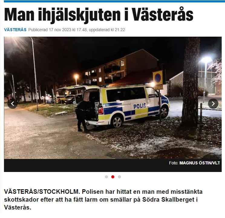قالت الشرطة السويدية مساء اليوم الجمعة ، أن إطلاق نار كثيف وقع في جنوب منطقة سكالبيرجيت في بلدية فاستيراس مساء اليوم الجمعة . وتلقت الشرطة عدة بلاغات من سكان المنطقة السكنية ،وفور وصول دوريات الشرطة السويدية تم العثور على رجل مصاب بطلقات نارية وتم استدعاء سيارات الإسعاف ولكن الرجل توفي فور وصوله إلى المستشفى عند الساعة 9:03 مساءً .