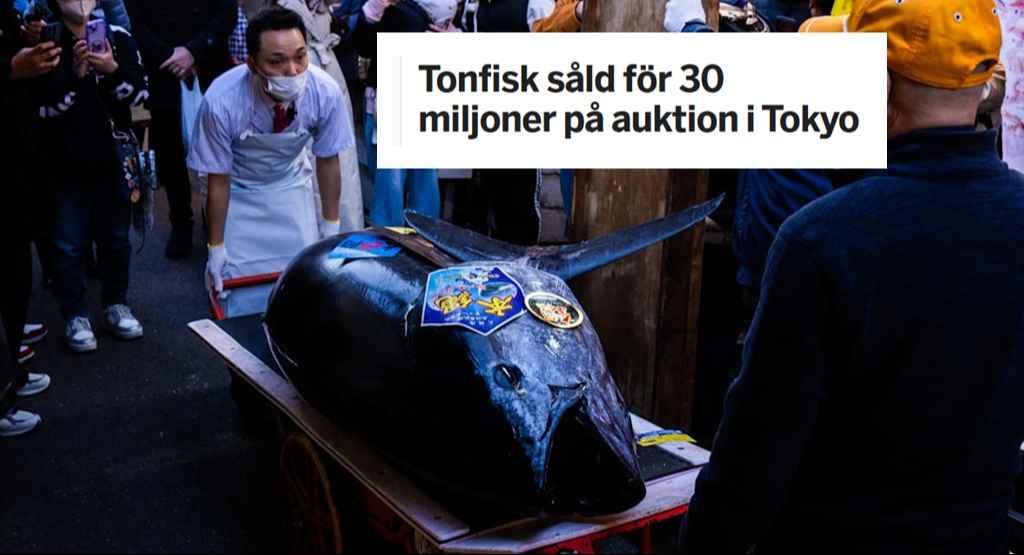 بيعَت سمكة تونة زرقاء الزعنفة في مزاد الأسماك الشهير بالعاصمة اليابانية طوكيو بسعر قياسي بلغ 510 ملايين ين ياباني، أي ما يعادل نحو 30 مليون كرون سويدي، في واحدة من أغلى الصفقات في تاريخ هذا المزاد السنوي. السمكة، التي بلغ وزنها 243 كيلوغراماً، سُجّل لها سعر يقارب 124 ألف كرون للكيلوغرام الواحد، متجاوزةً الرقم القياسي السابق البالغ 334 مليون ين، وبفارق كبير.