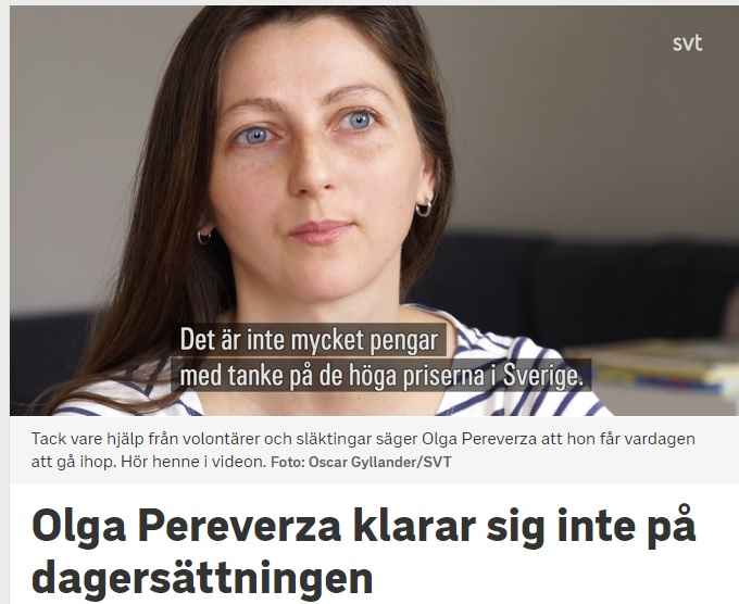 في أوائل مارس ، جاءت اللاجئة الأوكرانية أولغا بيريفرزا إلى السويد بعد فرارها من أوكرانيا مع طفليها. الآن يحق لهم الحصول على 71 كرونه لها و 40 كرون لكل طفل ، وبــ إجمالي 151 كرونة سويدية كبدل يومي من مجلس الهجرة السويدي. و يجب الأوكرانية على أولغا بيريفرزا أن يكون هذا المال كافيًا لكل شيء تقريبًا باستثناء السكن.
