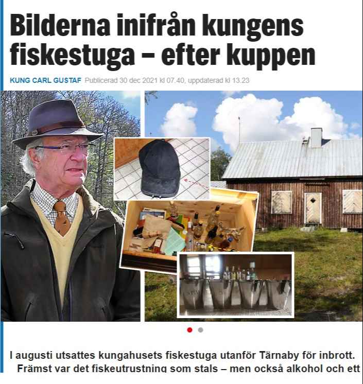 تعرض كوخ صيفي صغير  تعود ملكيته لملك  السويد كارل السادس عشر غوستاف للسرقة ، الكوخ يقع في منطقة  Forsavan, Tärnaby,  على الحدود السويدية النرويجية   ، ووفقاً للشرطة السويدية فأن  رجلًا في الأربعينيات من عمره وصبيًا في أواخر سن المراهقة قاموا باقتحام الكوخ وسرقة محتوياته.