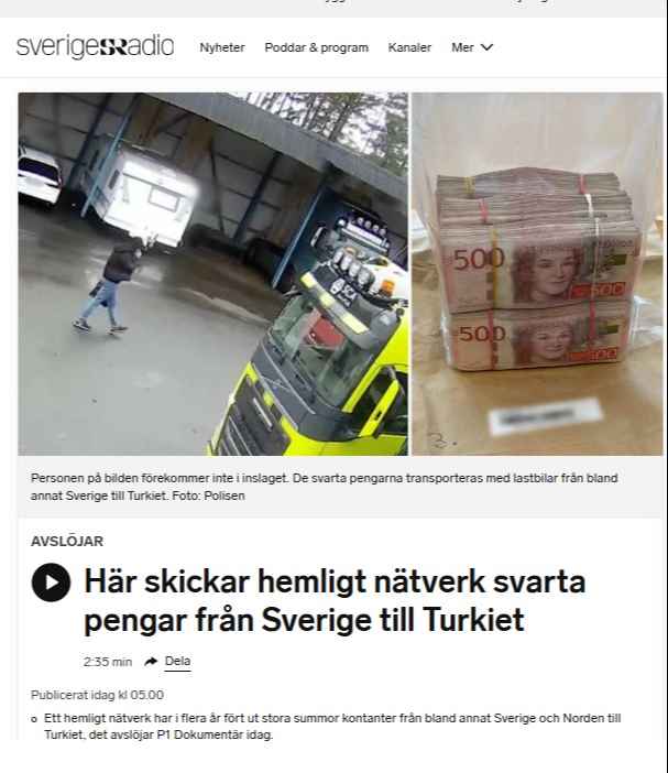 شبكة إجرامية لتهريب الأموال من السويد لتركيا يديرها مجموعة من المهاجرين من أصول تركية وكردية وعراقية ، حيث كشفت تحقيقات صحفية عن وجود شبكة سرية تعمل منذ سنوات على نقل أموال ضخمة “بعسرات الملايين من اليوروهات” وهي أموال غير مشروعة من السويد ودول الشمال الأوروبي باتجاه تركيا.