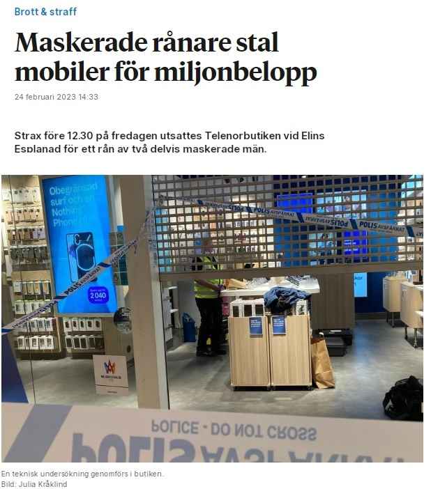 قالت الشرطة السويدية أن شابان  قاموا بــ  هواتف وإلكترونيات تبلغ قيمتها حوالي مليون كرون في عملية سطو مسلح على متجر في بلدية خوفده ظهر اليوم الجمعة واستطاعوا هواتفه وأجهزة إلكترونية والهروب بها .