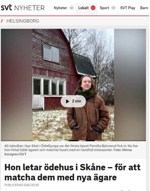 في قرية Eket التابعة لبلدية Örkelljunga شمال غرب إقليم Skåne في جنوب السويد، بدأ كل شيء بإشارة بسيطة: فيلا تعود لأربعينيات القرن الماضي تُركت فارغة لسنوات. هذه المعلومة كانت أول خيط وصل إلى بيرنيلا بيورفيرود، التي تقود مبادرة تحمل اسم “Hitta hem” — أي “اعثر على بيت”. ومنذ ذلك الحين، لم تكتفِ بالعثور على مالك العقار، بل نجحت أيضاً في ربط المنزل بعدة أشخاص مهتمين بشرائه وإحيائه من جديد.