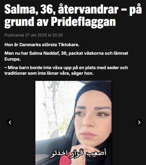 سلمى ندف، أكبر مؤثرة دنماركية على تيك توك، قررت العودة لوطنها سوريا أصبحت في دائرة أهتمام وسائل الإعلام الدنمكاركية والسويدية كحالة مهمة تتكرر من وقت لأخر حول رفض المهاجرين لقيم المجتمعات التي يعيشوا فيها .. وما جعل الإعلام يهتم اكثر هو السبب: انتشار رموز “برايد للمثليين” في مدارس أطفالها وشعورها بتعارض ذلك مع قيمها. عادت إلى سوريا بعد أحد عشر عامًا في الدنمارك. ولكنها عبّرت عن امتنانها لتجربتها الأوروبية الدنكاركية وشكرتهم ، لكنها اختارت مستقبلًا مختلفًا لأطفالها.