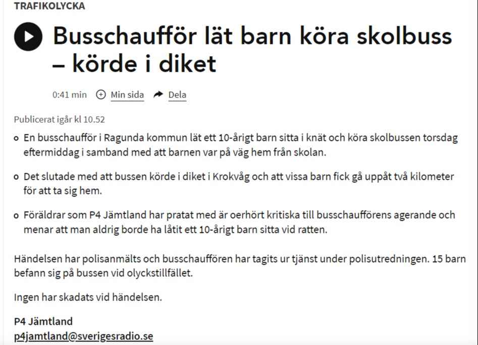 فتحت الشرطة تحقيقاً مع سائق باص مدرسي في بلدية Ragunda شمال السويد سمح لطفل يبلغ من العمر 10 سنوات بالجلوس في حضنه وقيادة الباص المدرسي من أجل الترفيه والمتعة ، حتى أنزلق الباص عن الطريق .